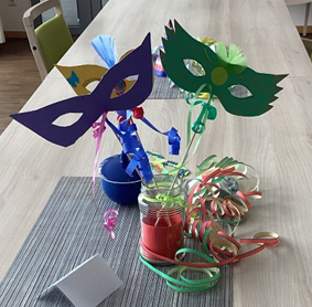 Bereits im Vorfeld entstand unsere Tischdekoration und jeder Bewohner hat eine Faschingsmaske gestaltet.