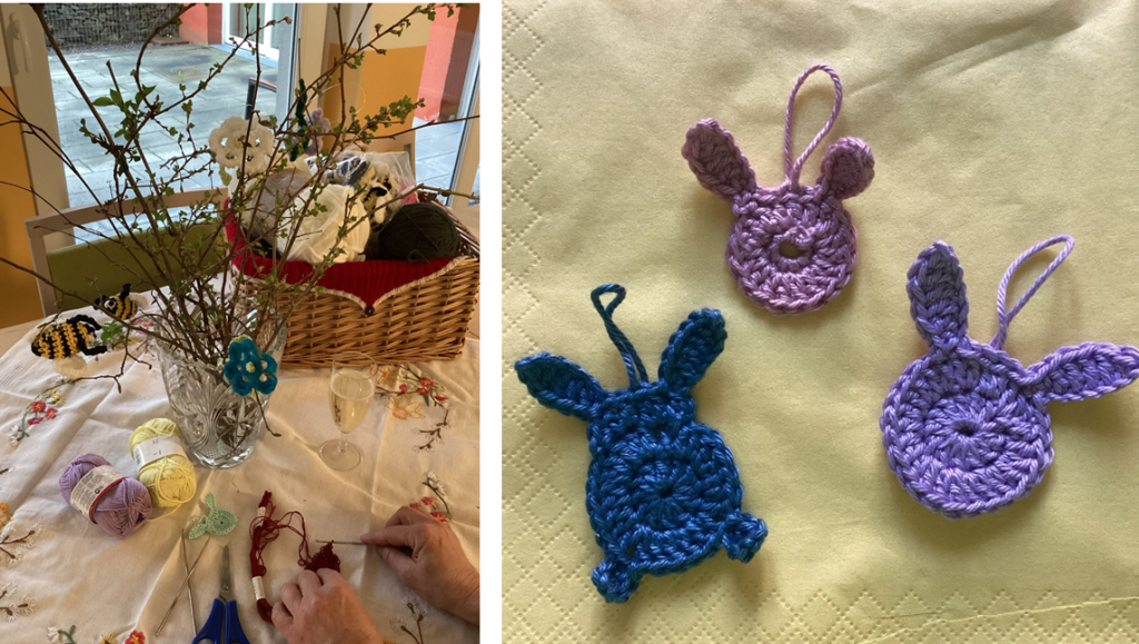 Es gab die Anfrage unserer langjährigen Bewohnerinnen, die bekannte Tradition wieder aufleben zu lassen und viele neue Bewohnerinnen kamen dazu. Häkeln und Stricken ist in der Generation der heute 80 – 100jährigen ein beliebter Zeitvertreib, ist aber früher auch ein notwendiges „Muss“ gewesen. Die Kinder wurden „eingestrickt“, später die Familie mit Stricksocken versorgt. Und auch heute erfreut sich dieses Hobby noch großer Beliebtheit.